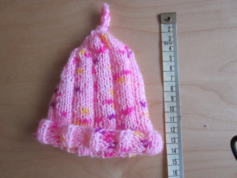 Pleteme asi 8cm od lemu a začneme ujímat .Ujmeme 7-8 ok rozloženě tak ,by nám zbylo pár ok na zakončení.Ujímáme každou lícovou řadu.Zbyde nám odhadem asi 26 ok, pleteme ještě 1,5 cm a pak všechny oka uzavřeme .Sešijeme švy .Na hoře čepičky můžeme nechat malý otvůrek pro hadičku od infuze , nebo sešijeme asi 1,5 cm pod zakončením a ohrneme .