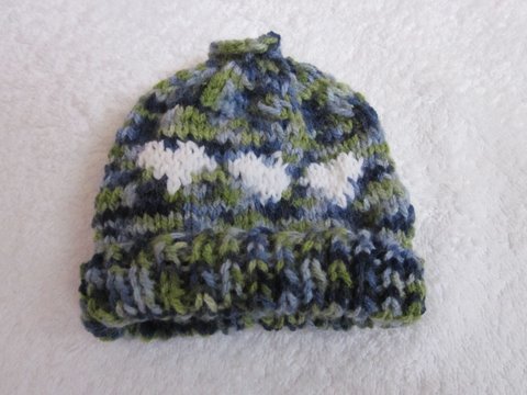 Větší čepičku pleteme z 60 ok a pleteme pružným vzorem hladce obrace do výšky asi 4cm. Dále pleteme vzor dle libosti např.....1řada hladce , 2 řada obrace.....Srdíčka jsou pleteny stejným vzorem jen jiná vlna a to podle obrázku níže.